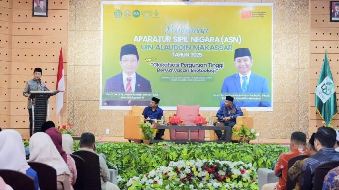 وزير الشؤون الدينية نصر الدين عمر يدعو جامعة علاء الدين الإسلامية الحكومية بمكاسار لتكون مركزًا عالميًا للمعرفة الإسلامية، مؤكّدًا أهمية البحث والتكامل الأكاديمي.